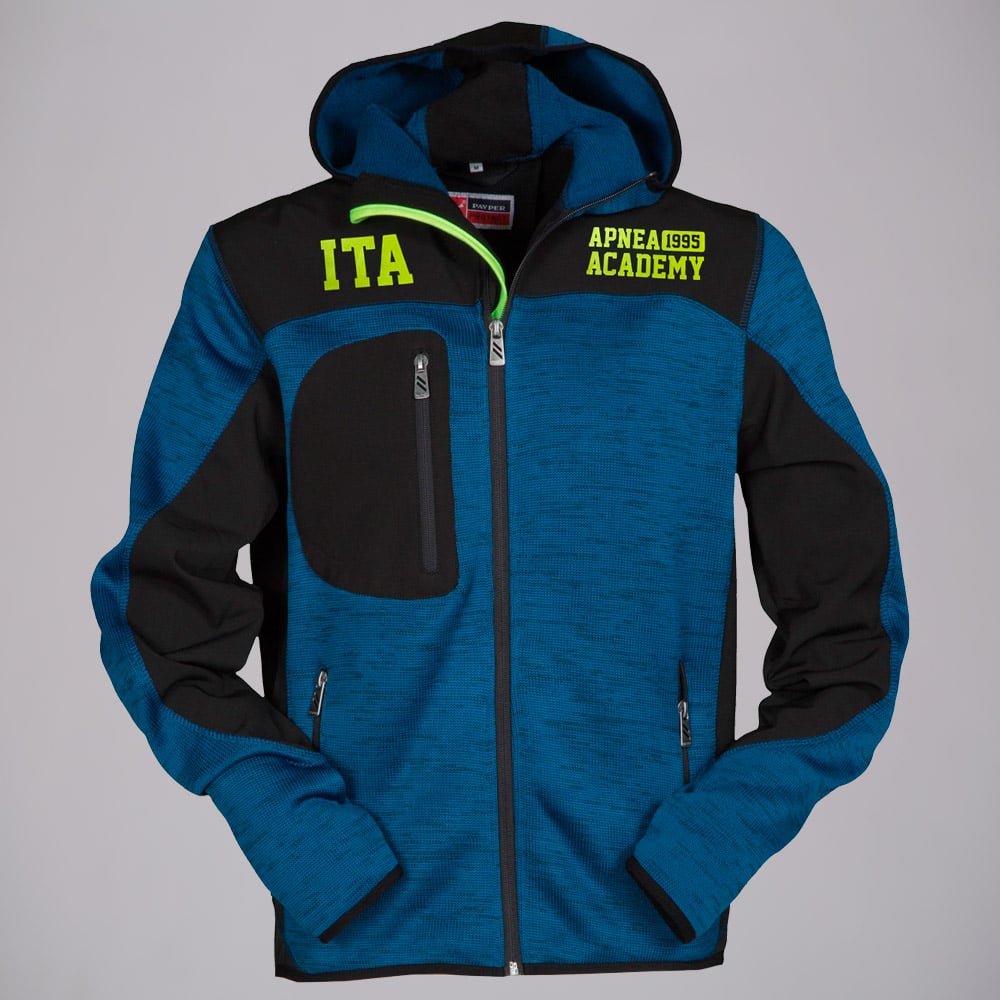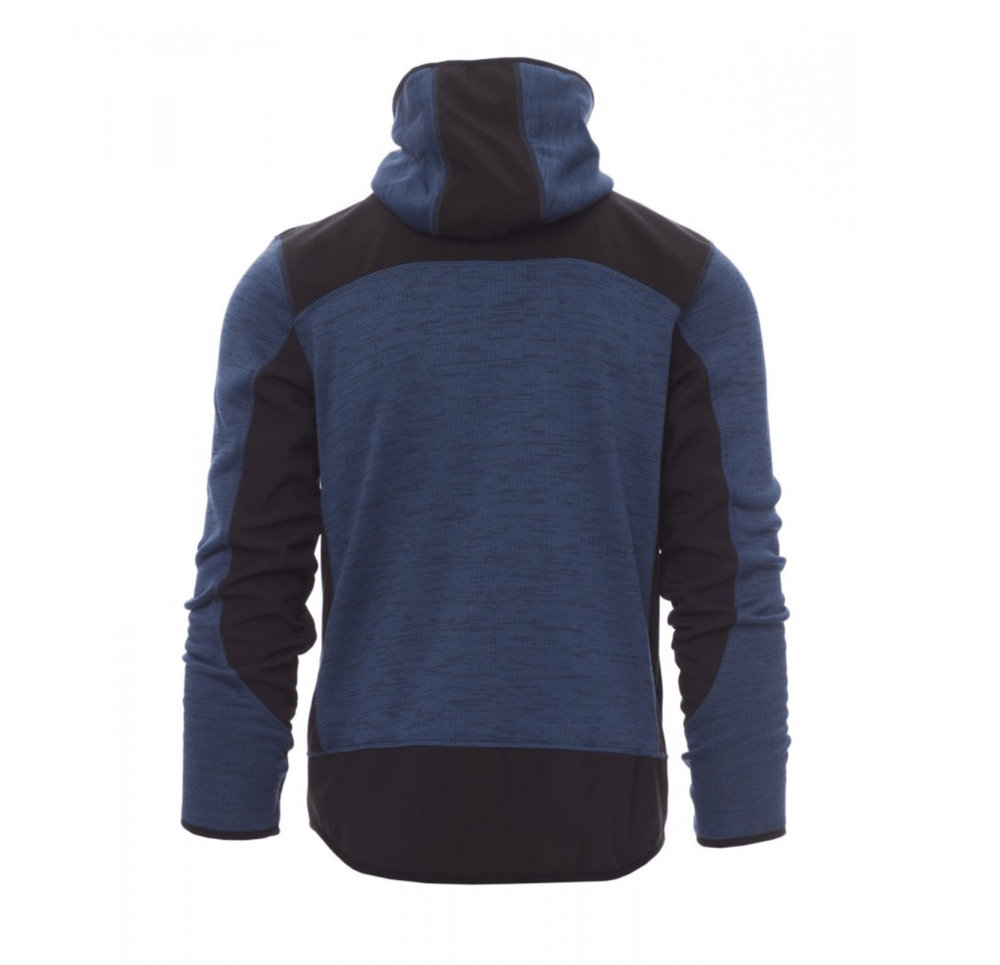 Giacca ergonomica da uomo con cappuccio, lavorazione a maglia con inserti in softshell nero, zip lunga SBS nastrata, due tasche laterali con zip, una tasca al petto.