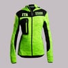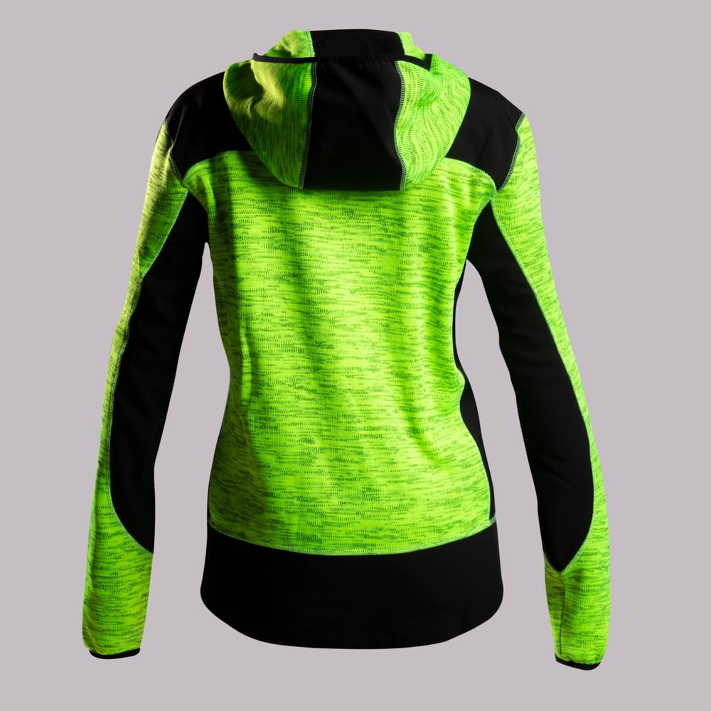 Giacca ergonomica da donna con cappuccio, lavorazione a maglia con inserti in softshell nero, zip lunga SBS nastrata, due tasche laterali con zip, una tasca al petto.