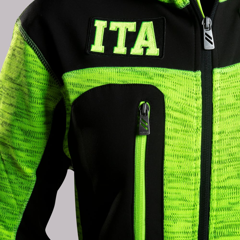 Ergonomic Jacket with hood, knitting with inserts in black softshell, long SBS taped zip, two side zip pockets, one chest pocket.