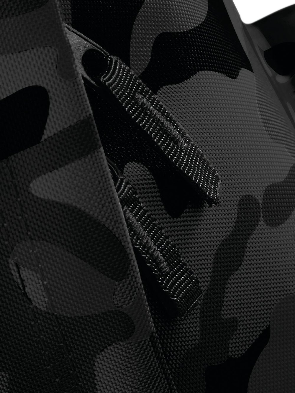Backpack with front pocket with zip, padded back and hook for hand grip.