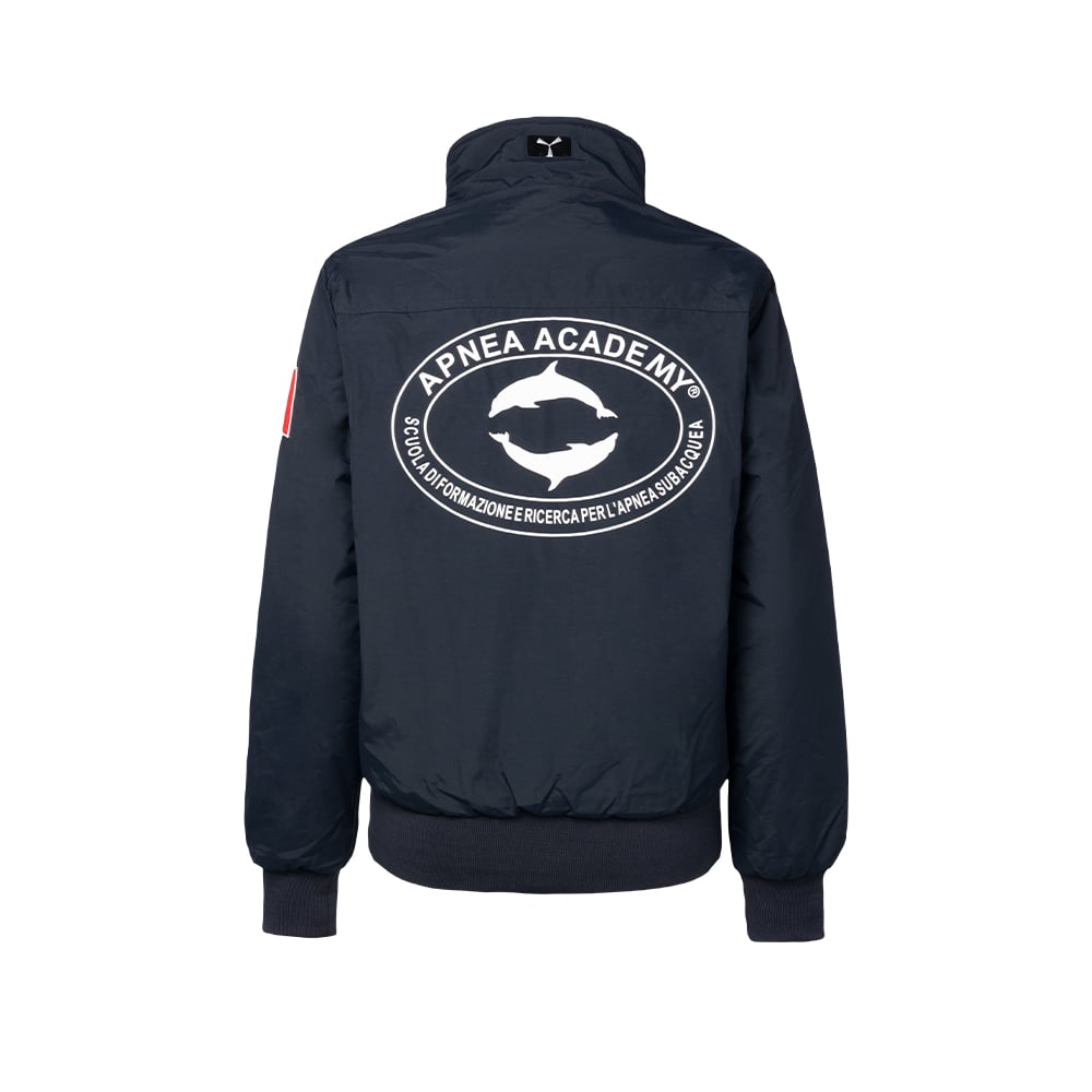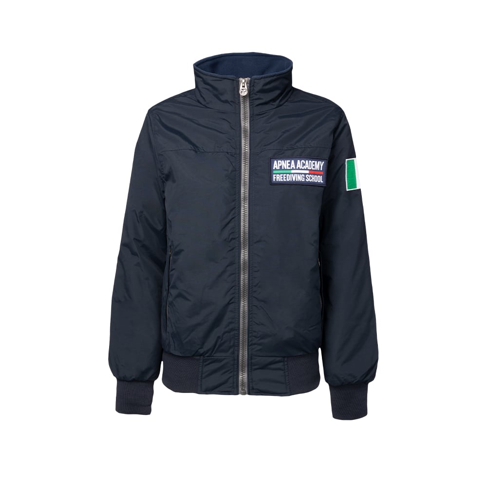 Jacket with rib elastic waist and wrists, covered zipper, two pockets; padded interior and microfleece inside the collar and back, finely edged with breathable underarm inserts, two inside pockets.